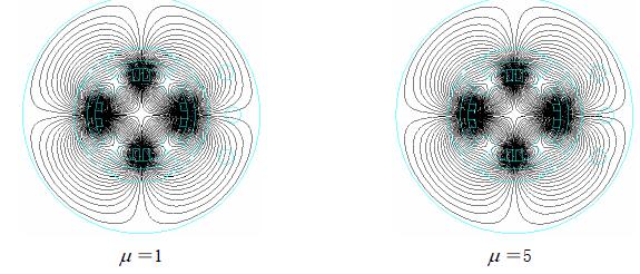 為了更廣泛地研究廢鐵對測量的影響,選擇廢鐵的半徑為R = 0.5mm,1mm,1.5mm,2mm,2.5mm,3mm,磁導率μ在1到1之間變化。 參照圖15來計算各種條件下的磁場分布。 本文只給出了r = 2mm時各種滲透率的變化規律,如圖2-17所示。 對于其他大小,情況也類似。