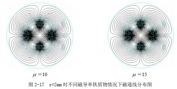 從圖2-17中可以看到,隨著廢鐵的磁導率的增加,廢鐵的磁導率也隨之增加,因此其附近的磁場也發生了變化。但是,該變化很小,如從1到15的磁導率變化可以看到的,并且通量線的分布并沒有很大的不同。磁通線僅在最接近廢鐵的位置處具有很小的變形,并且幾乎不影響在其他位置的磁通線的分布。因此,管中鐵屑的存在對儀器的測量結果影響很小。